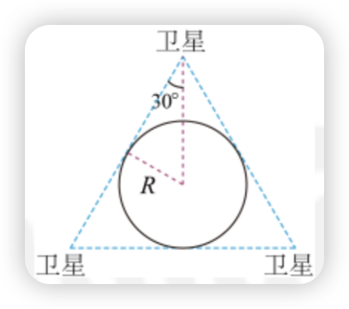 可知,做圆周运动的半径越小,则运动周期越小。由于需要三颗卫星使地球赤道上任意两点之间保持无线电通讯,所以由几何关系可知三颗同步卫星的连线构成等边三角形并且三边与地球相切,如图